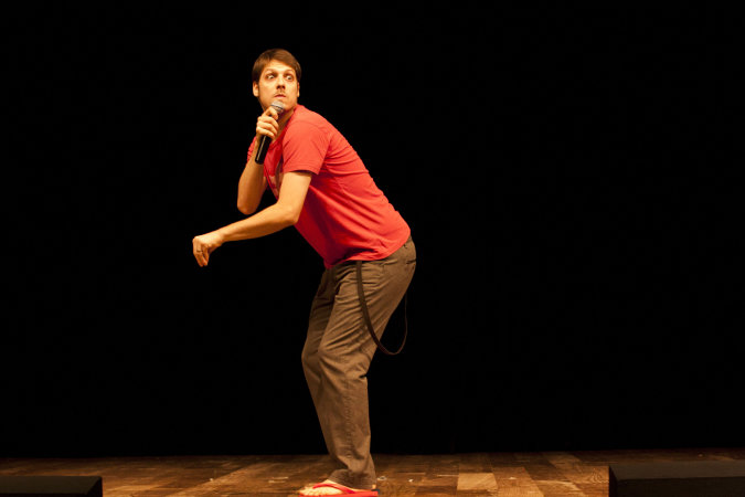 Fábio Porchat surgiu bem simples. Camiseta vermelha, calça jeans e chinelo havaianas de cada cor. Começou falando na plateia, pedindo para silenciarem os celulares. Fotos são liberadas, porém vídeos não.
